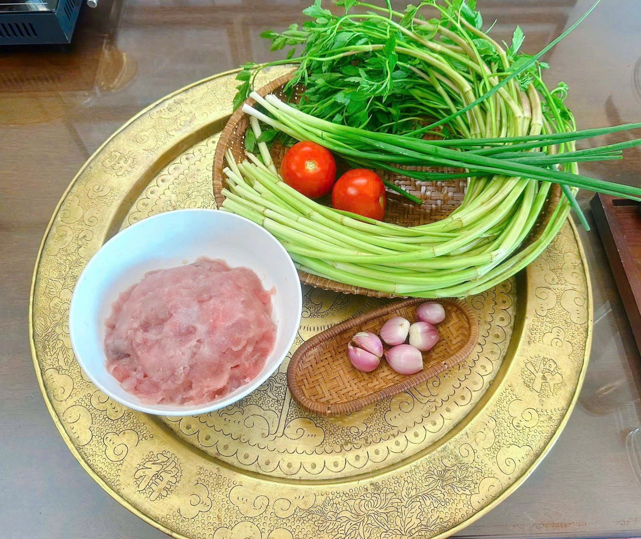Rau cần: Nhặt bỏ rễ và lá úa, rửa sạch nhiều lần với nước. Cắt khúc dài khoảng 5–6cm, để ráo.