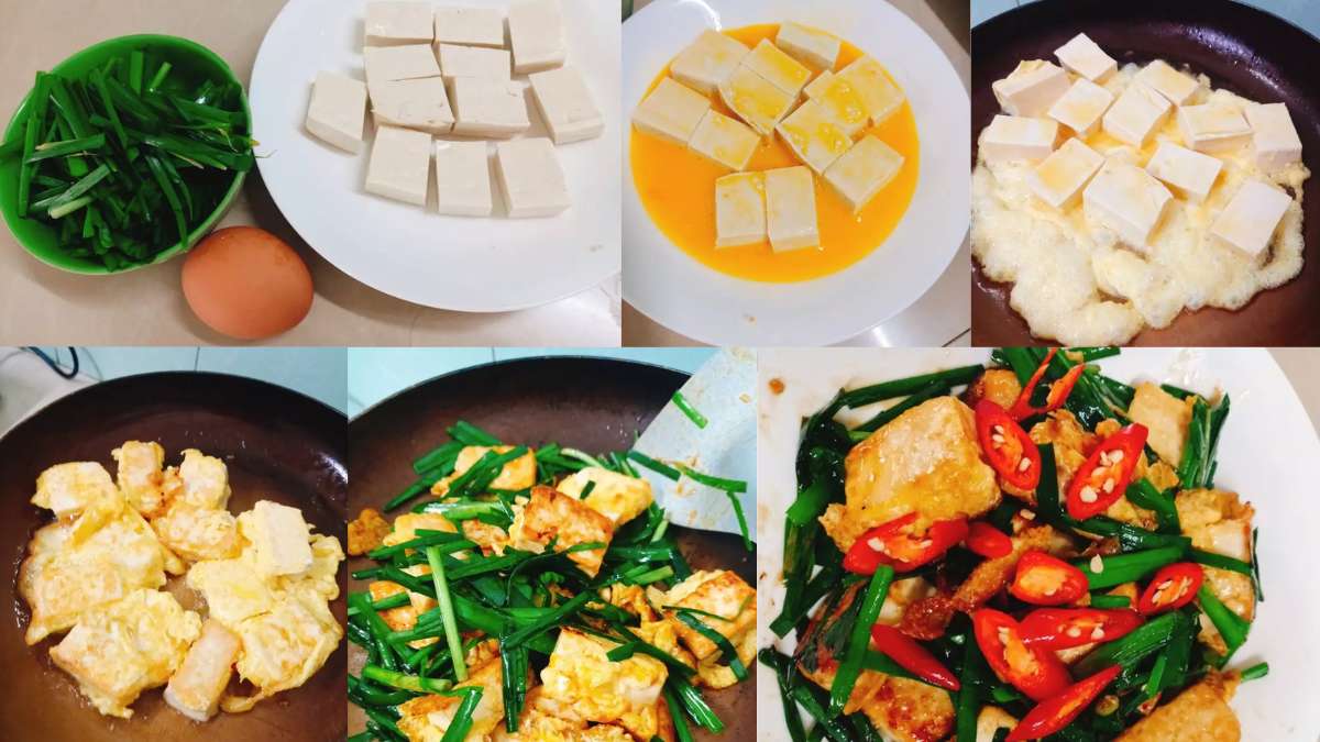Đậu hũ sau khi cắt thành miếng vuông nhỏ được chiên sơ trong chảo dầu nóng cho đến khi vàng đều hai mặt. Mùi đậu chiên thơm lừng lan ra khắp bếp, nghe như tiếng mời gọi của tuổi thơ. Bên cạnh đó, trứng gà được luộc chín, bóc vỏ cẩn thận để lòng trắng mịn, không sứt sẹo.